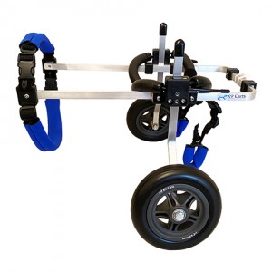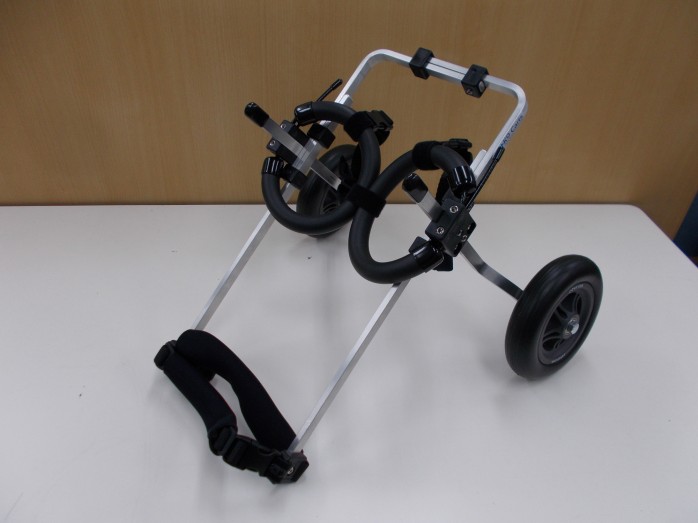 ペットの肢の衰えに対応して後肢サポート車いすにパーツ(補助前輪・後付前輪)を加えて